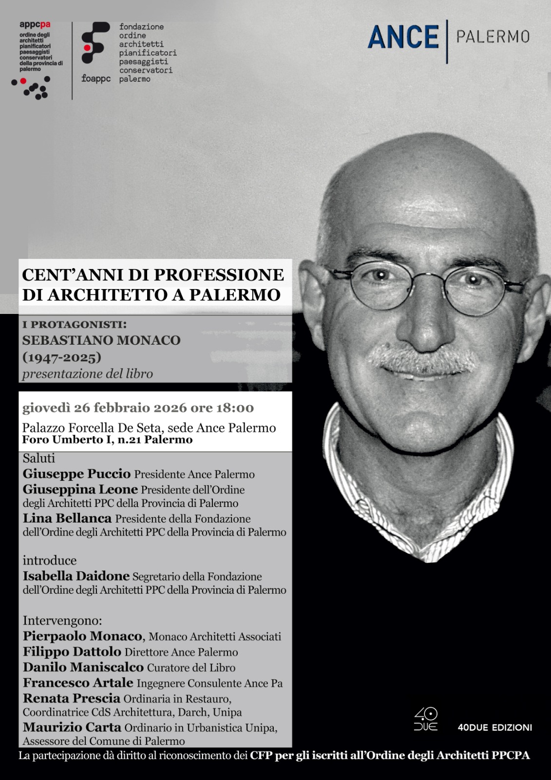 Sarà presentato giovedì 26 febbraio, nella sala conferenze di Palazzo Forcella De Seta, il libro dedicato a Iano Monaco “Cent’anni di professione di architetto”, curato da Danilo Maniscalco e realizzato dall’ Ordine degli Archietti di Palermo, dalla Fondazione dell’Ordine degli Architetti di Palermo e da Ance Palermo.