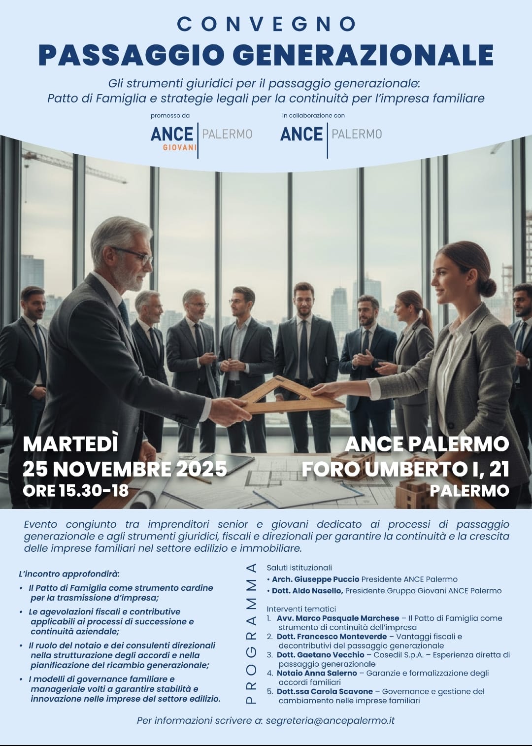 Evento congiunto tra imprenditori senior e giovani dedicato ai processi di passaggio generazionale e agli strumenti giuridici, fiscali e direzionali per garantire la continuità e la crescita delle imprese familiari nel settore edilizio e immobiliare.